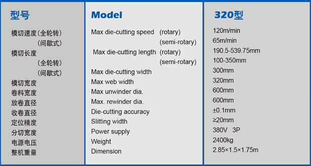 ZM-320型間歇.全輪轉商標模切機是我公司獨立研發(fā)的集光、機、電于一體的新型模切、分條設備。該機整套控制系統(tǒng)及伺服系統(tǒng)采用德國、廠家、新產品,整機由六個部分組成:放卷、糾偏、覆膜、精確套準模切、分條、成品、復卷。